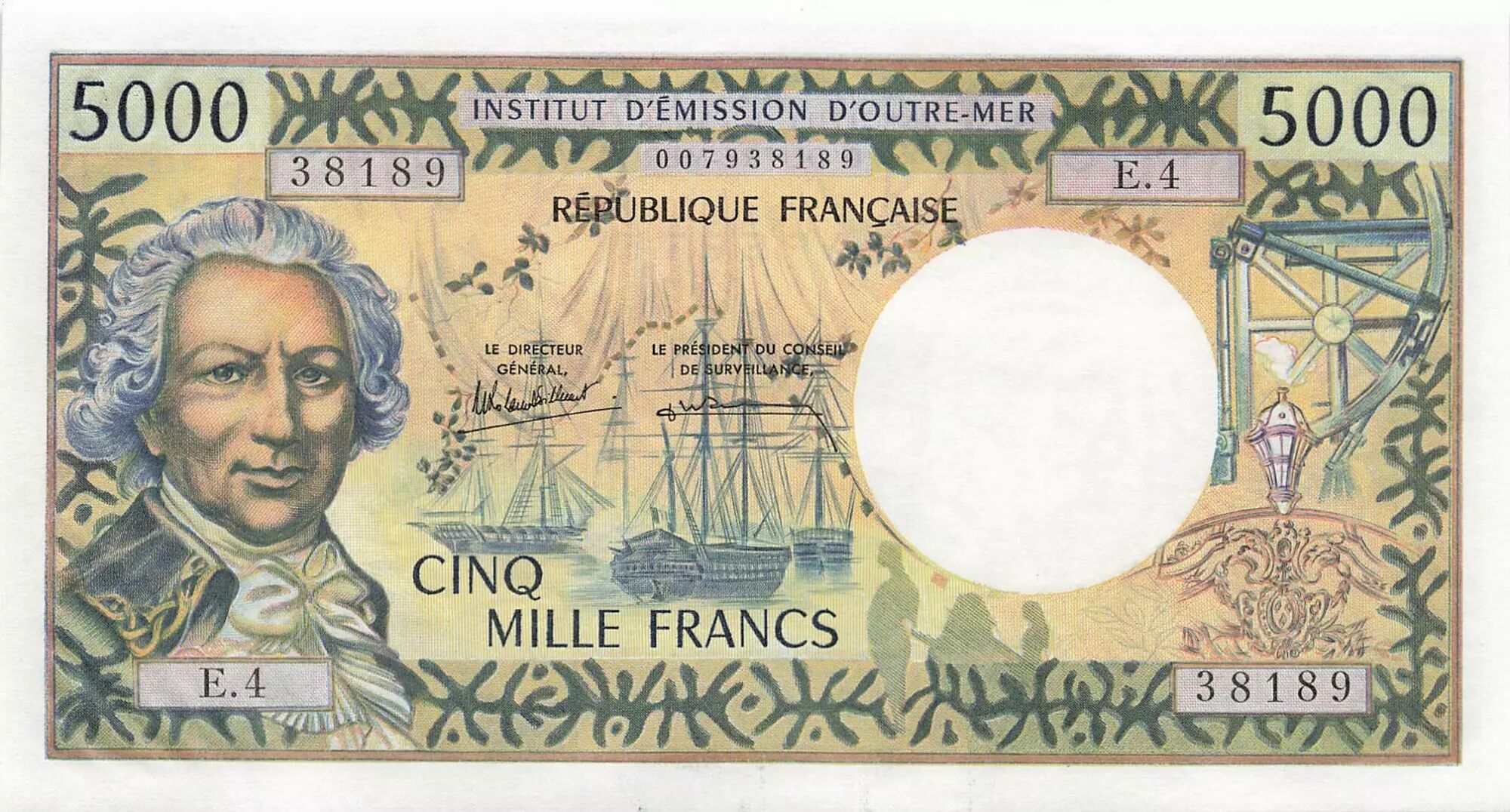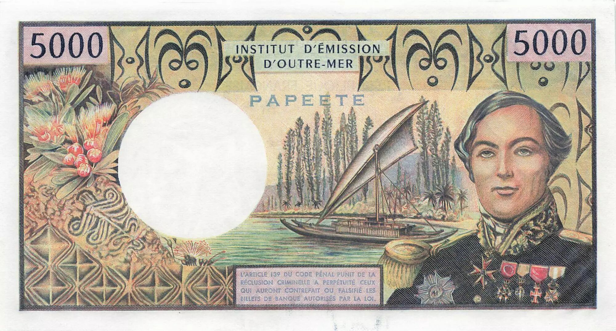 Home > World Banknotes > Oceania Banknotes > Tahiti > Tahiti 5000 Francs - Bougainville - ND (1985) - P.28d
