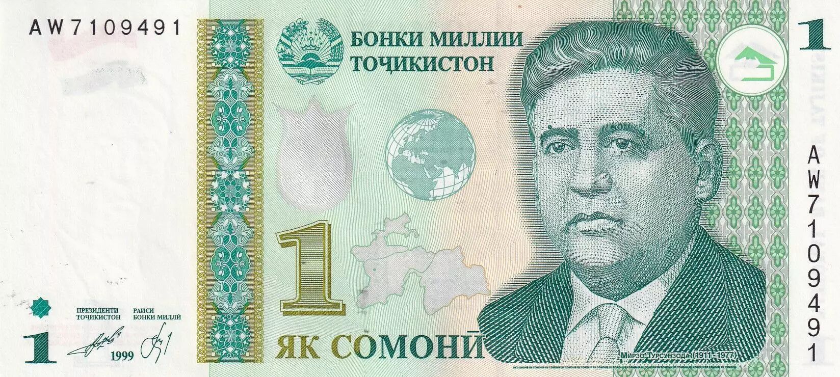 Banknote Tajikistan 1 Somoni - Mirzo Tursunzoda - 1999 (2010) - Serial AW - P.14A