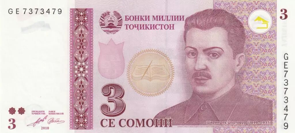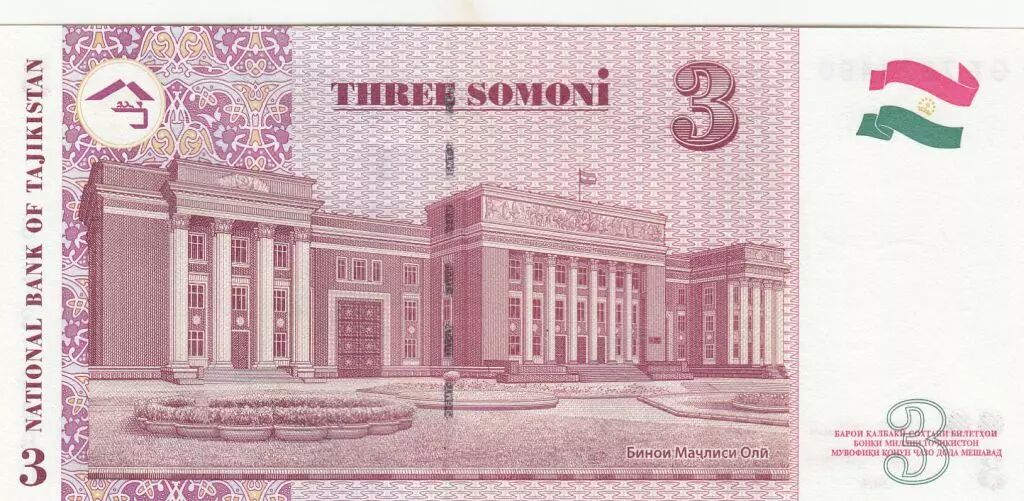 Banknote Tajikistan 3 Somoni 2010 - Shirinsho Shotemur, Parliament Building