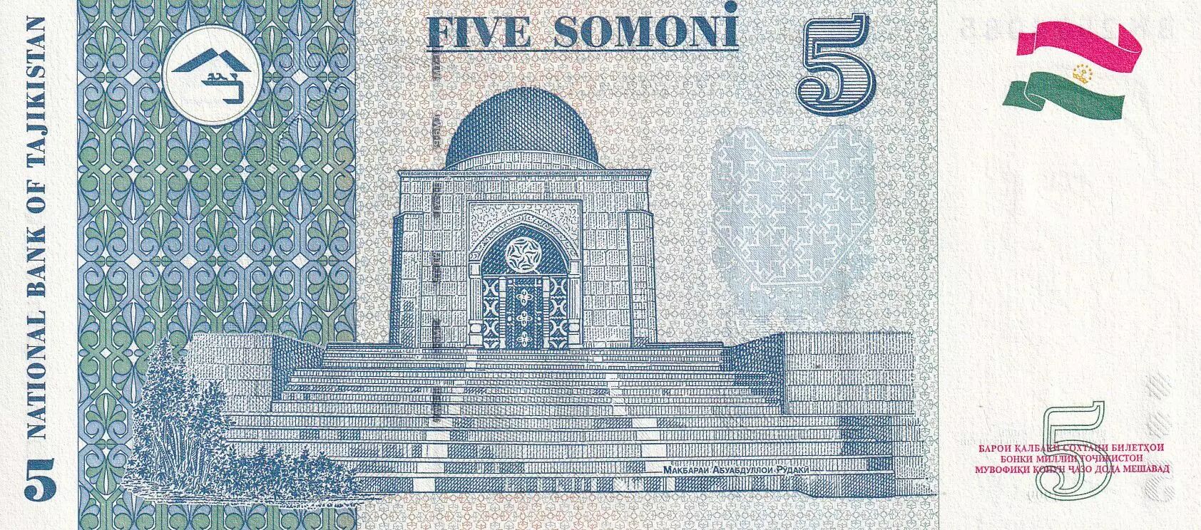Banknote Tajikistan 5 Somoni - S. Ayni - Shrine of A. Rudaki - 1999 - UNC - P.15