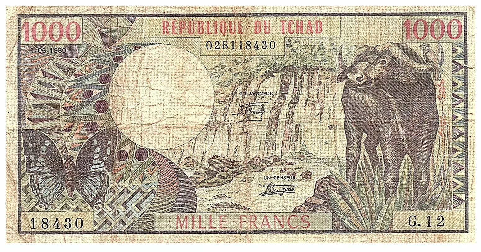 Accueil > Archivage > Tchad 1000 Francs - Animaux - Transports - Masque - 01-06-1980 - Série G.12 - P.7