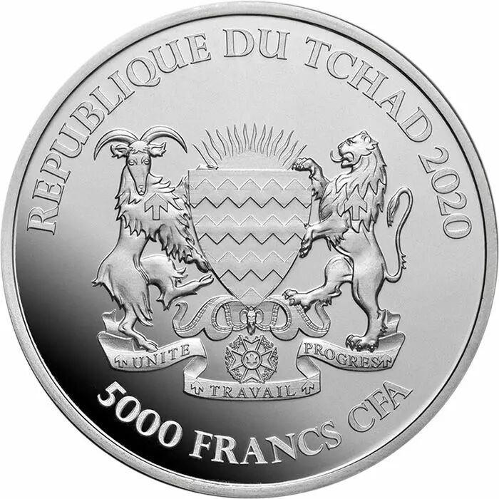 Le verso est illustré par les armoiries du pays ainsi que la devise "Unité travail progrès".