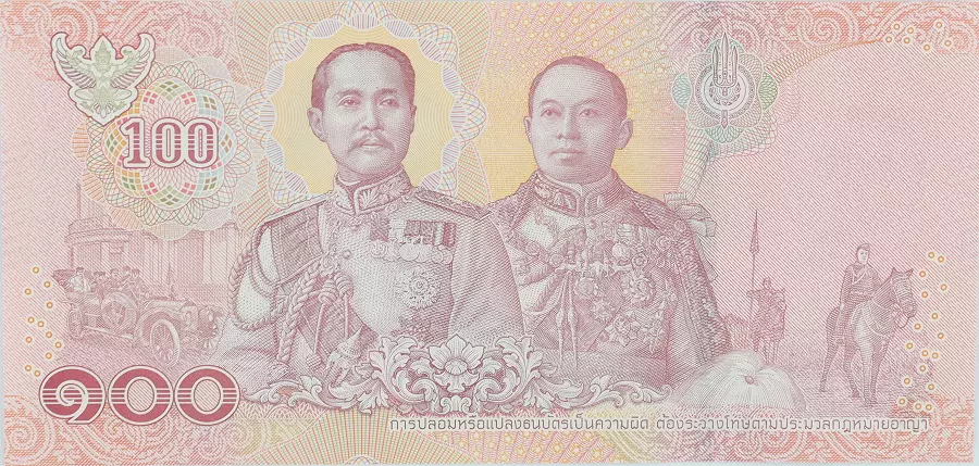 The reverse of the note features half-length figures of Kings Rama V and Rama VI, both facing front, but with their eyes directed towards the center. A representation of Rama V's royal trip to Notodden, Norway, aboard a car driven by Sam Eyde, is visible at the bottom left of Rama V. King Rama VI on horseback, symbolizing the foundation of the Thai scouts, is illustrated at the bottom right of King Rama VI. A Trishula trident in Chakra on a guilloche background is located at the top right of King Rama VI. The denomination in Arabic numerals is positioned on a guilloche background in the upper left, while the denomination in Thai numerals is located in the lower left corner. EURion constellations are present in the lower left, upper right, and lower right corners. Repetitive Uniline microtexts "100" are hidden in the background.