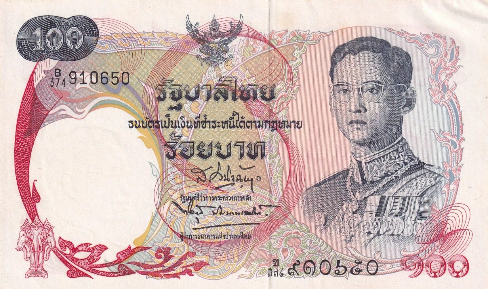This 100 Baht banknote issued by Thailand between 1968 and 1972 pays tribute to King Rama IX, an emblematic figure of the country. The banknote is part of the B374 series.