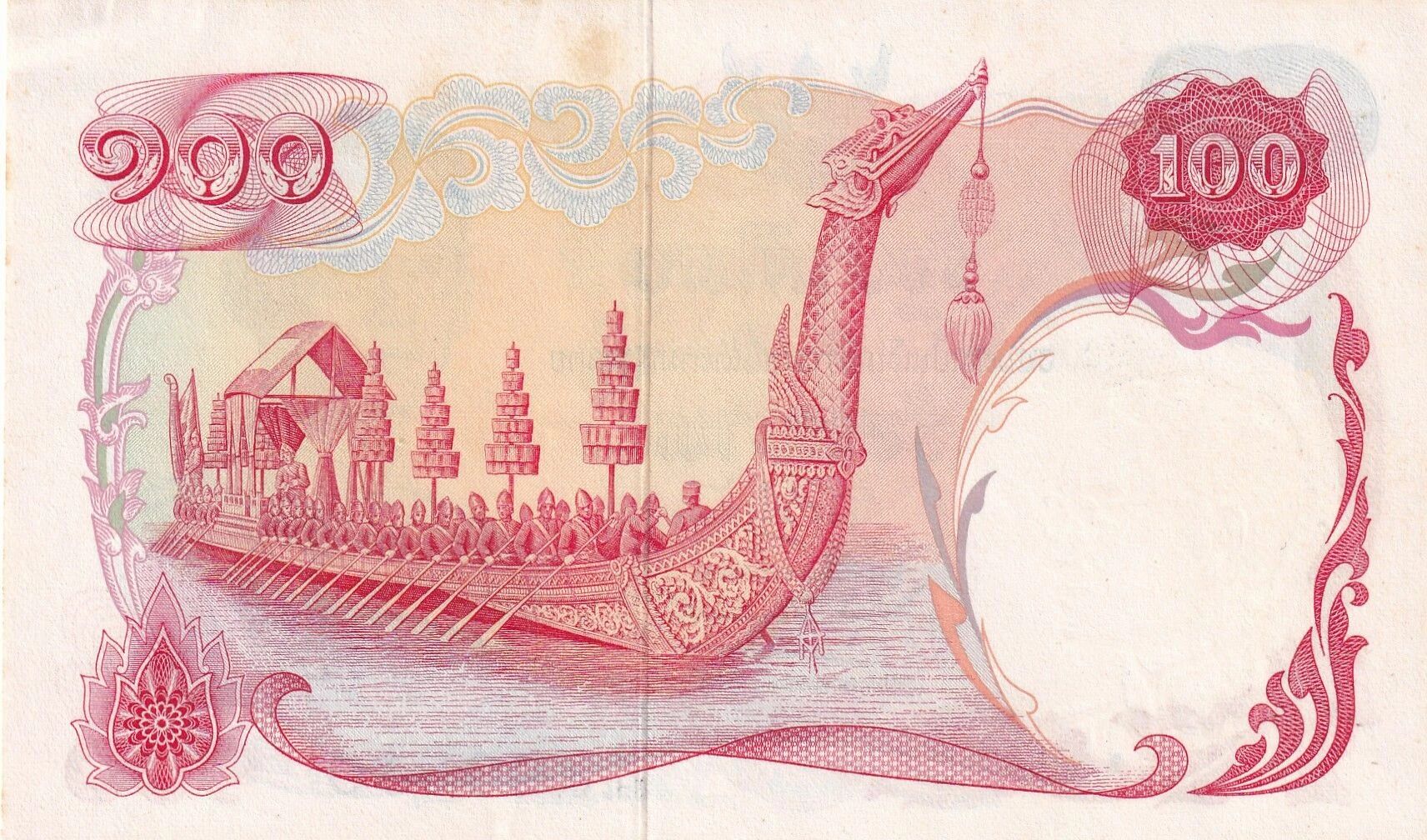 The back of the banknote depicts the royal barge "Suphannahong." This traditional boat is a symbol of royalty and Thailand's cultural richness. Its inclusion underlines the importance of maritime and river traditions in the country's history.