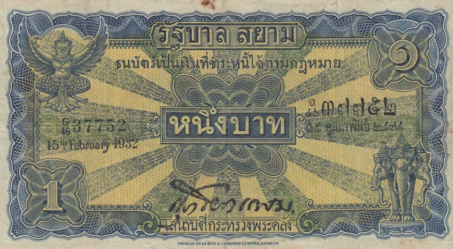 Voici une fiche descriptive du billet de 1 Baht émis en Thaïlande en 1932 :