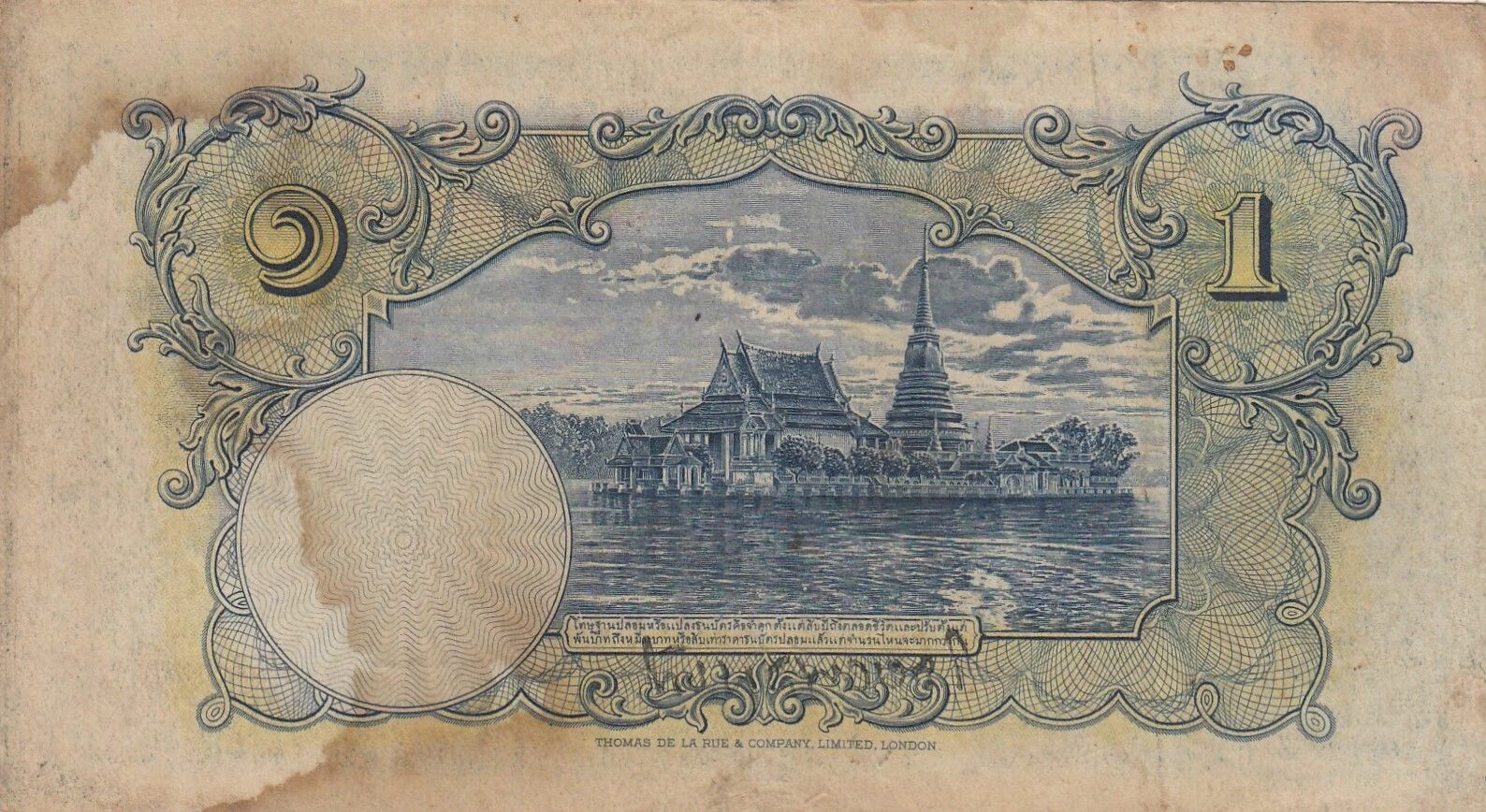 Le billet de 1 baht thaïlandais, émis en 1936, est un spécimen de la série D75. Il représente une unité monétaire de Thaïlande sous le règne du roi Rama VIII.