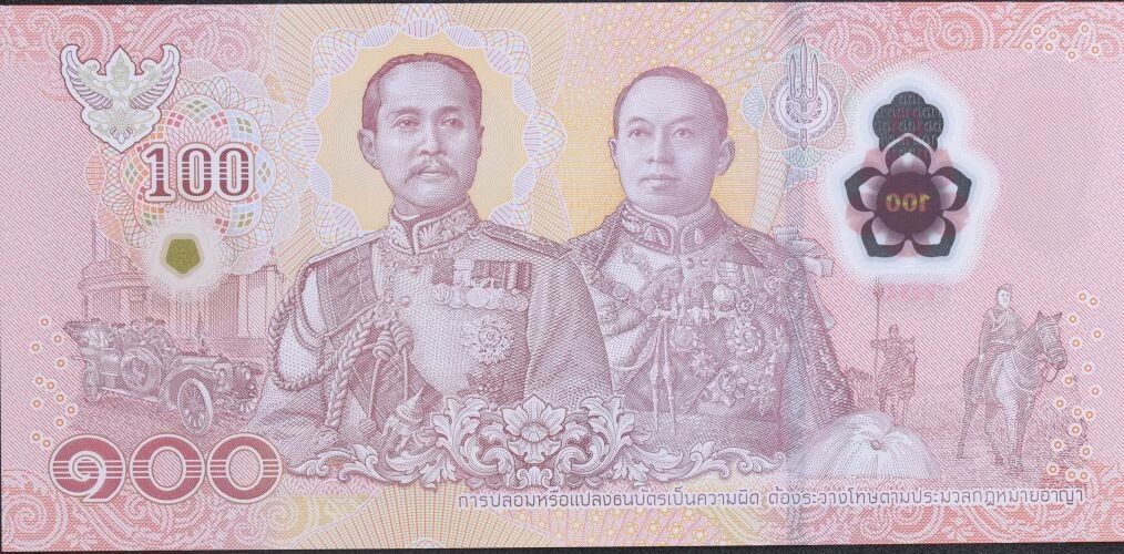 Le verso du billet est également imprimé en rouge, avec des sous-impressions multicolores. Il présente des figures en demi-longueur des rois Rama V et Rama VI, tous deux de face mais regardant vers le centre. Une scène du voyage royal de Rama V à Notodden, en Norvège, dans une voiture conduite par Sam Eyde, est représentée en bas à gauche de Rama V. Le roi Rama VI à cheval, lors de la fondation des scouts thaïlandais, est visible en bas à droite du roi Rama VI. Le trident Trishula en Chakra sur fond guilloché est situé en haut à droite du roi Rama VI. La valeur nominale est indiquée en chiffres arabes sur fond guilloché en haut à gauche et en chiffres thaïlandais dans le coin inférieur gauche. Des constellations EURion sont présentes dans les angles inférieur gauche, supérieur droit et inférieur droit. Des microtextes répétitifs "100" sont cachés en arrière-plan.