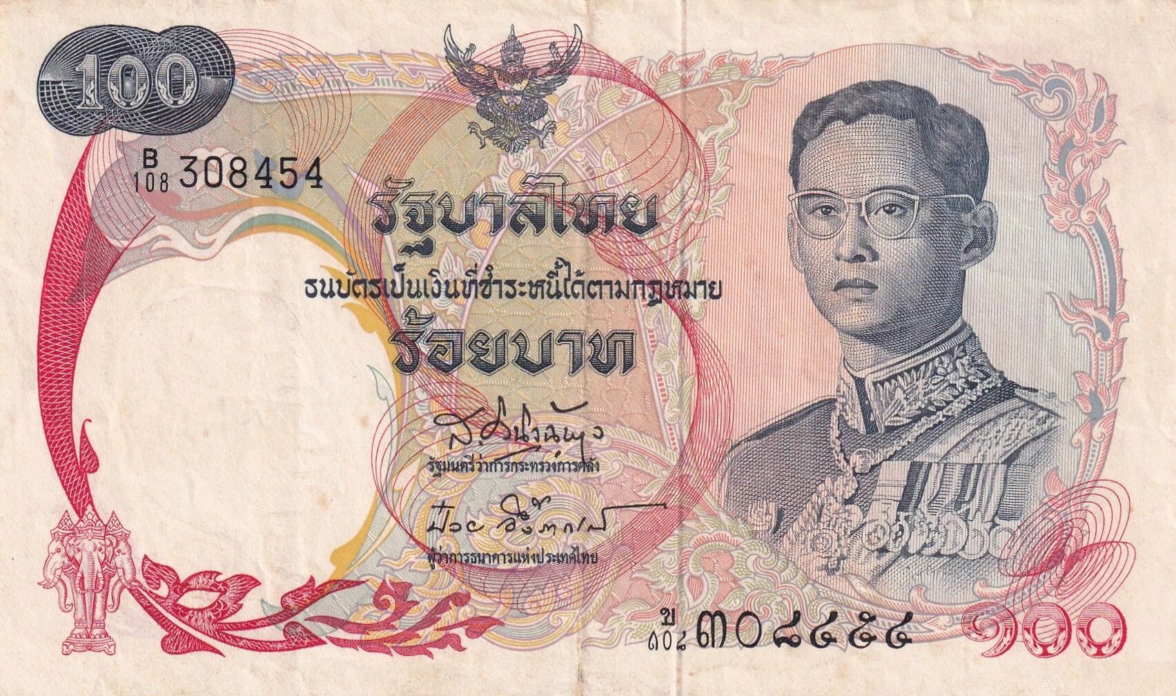 Ce billet de banque thaïlandais a une valeur nominale de 100 baht. Il a été émis entre 1968 et 1972.