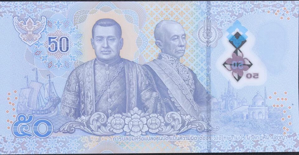 Le verso du billet présente une impression bleue avec des sous-impressions multicolores. On y trouve un portrait en buste du roi Rama III de face et du roi Rama IV de profil droit. Une jonque chinoise est représentée en bas à gauche de Rama III, et l'observatoire de Khao Wang en bas à droite du roi Rama IV. L'emblème de la dynastie Chakri, représentant le trident Trishula pointant vers le haut, inséré dans un disque Chakra, sur fond guilloché, est visible en haut à droite du roi Rama IV. Des constellations EURion sont présentes dans le coin supérieur gauche, en bas du bord gauche et en bas du bord droit. Un microtexte répétitif « 50 » est dissimulé dans les motifs de fond, ainsi qu'un microtexte répétitif multiligne « 50 » dissimulé dans les motifs entourant la valeur faciale en chiffres arabes. Le chiffre « 5 » en braille est représenté en relief en haut à droite.