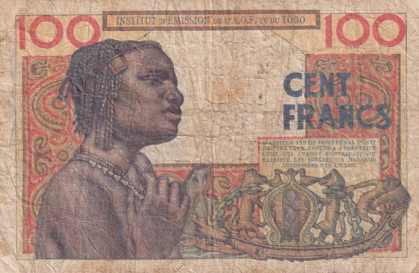 Le recto du billet présente un masque sur le côté gauche. À droite, une femme portant des tresses est représentée. L'inscription "INSTITUT D'EMISSION DE L'A.O.F. ET DU TOGO" est visible, ainsi que la valeur "cent francs". L'ensemble des inscriptions est rédigé en écriture latine. Le concepteur de ce billet est Clément Serveau.