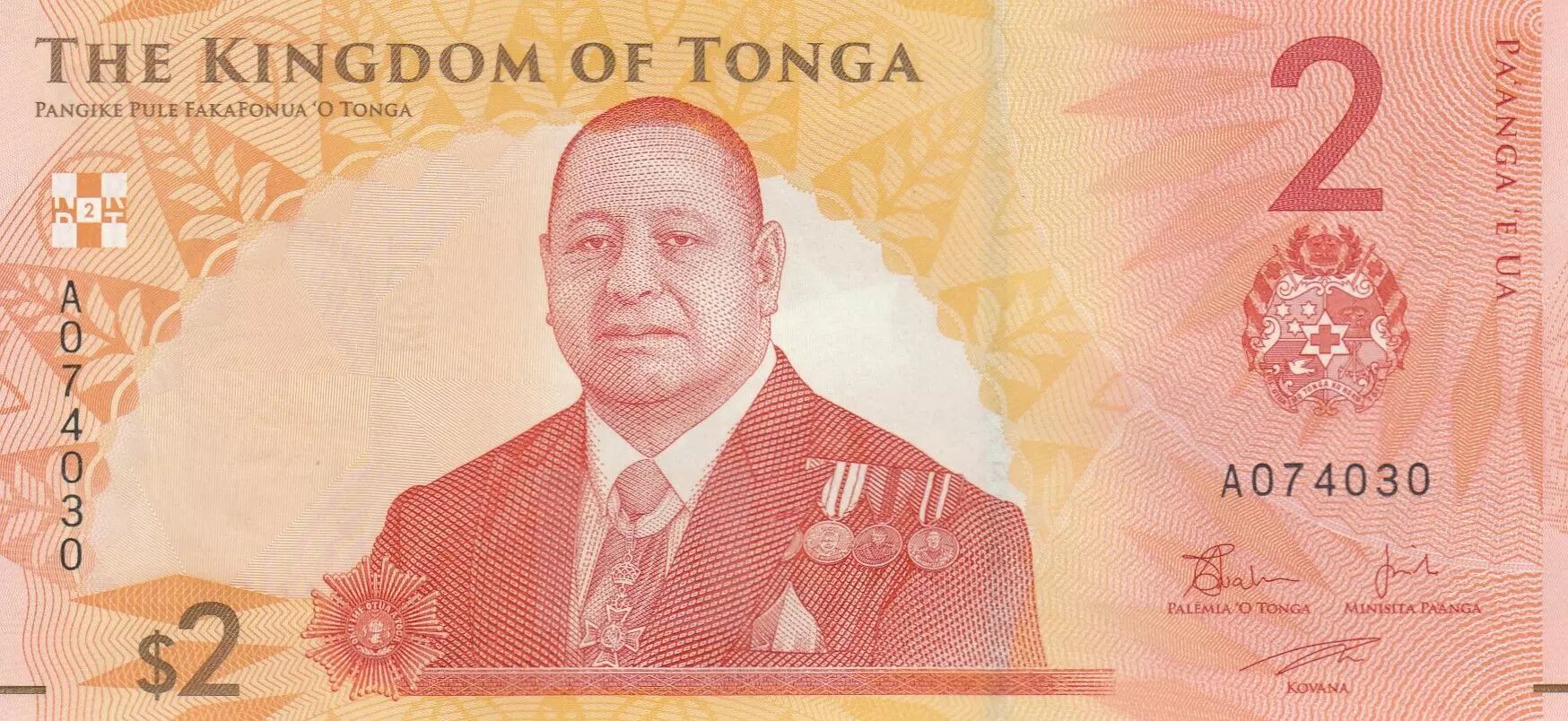 The 2 pa?anga banknote from Tonga, issued in 2023 (series A0), is printed on a light red background and measures 150 × 70 mm. On its front, there is a portrait of King Tupou VI in a medallion, accompanied by the kingdom's coat of arms. The inscriptions are in English and Tongan, affirming the national identity and monetary authority.