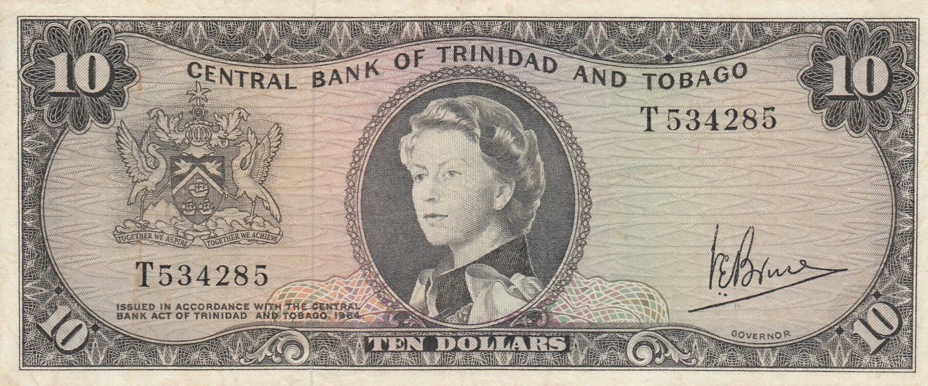 This 10 dollar banknote was issued by Trinidad and Tobago in 1964, part of the T series. It features the effigy of Queen Elizabeth II. The banknote has a face value of 10 dollars.