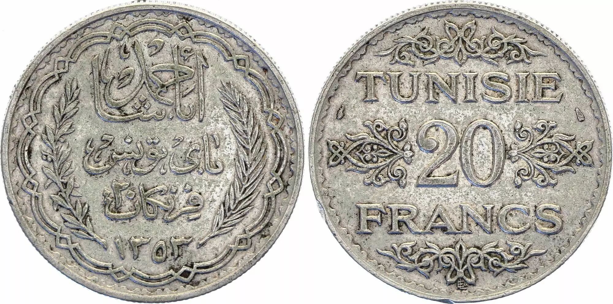 This coin is a 20 Francs piece, issued by Tunisia in 1935, corresponding to the year 1353 of the Islamic calendar. It is minted in silver and weighs 20 grams. Its diameter is 35 millimeters. The coin is associated with Ahmad Pasha.
