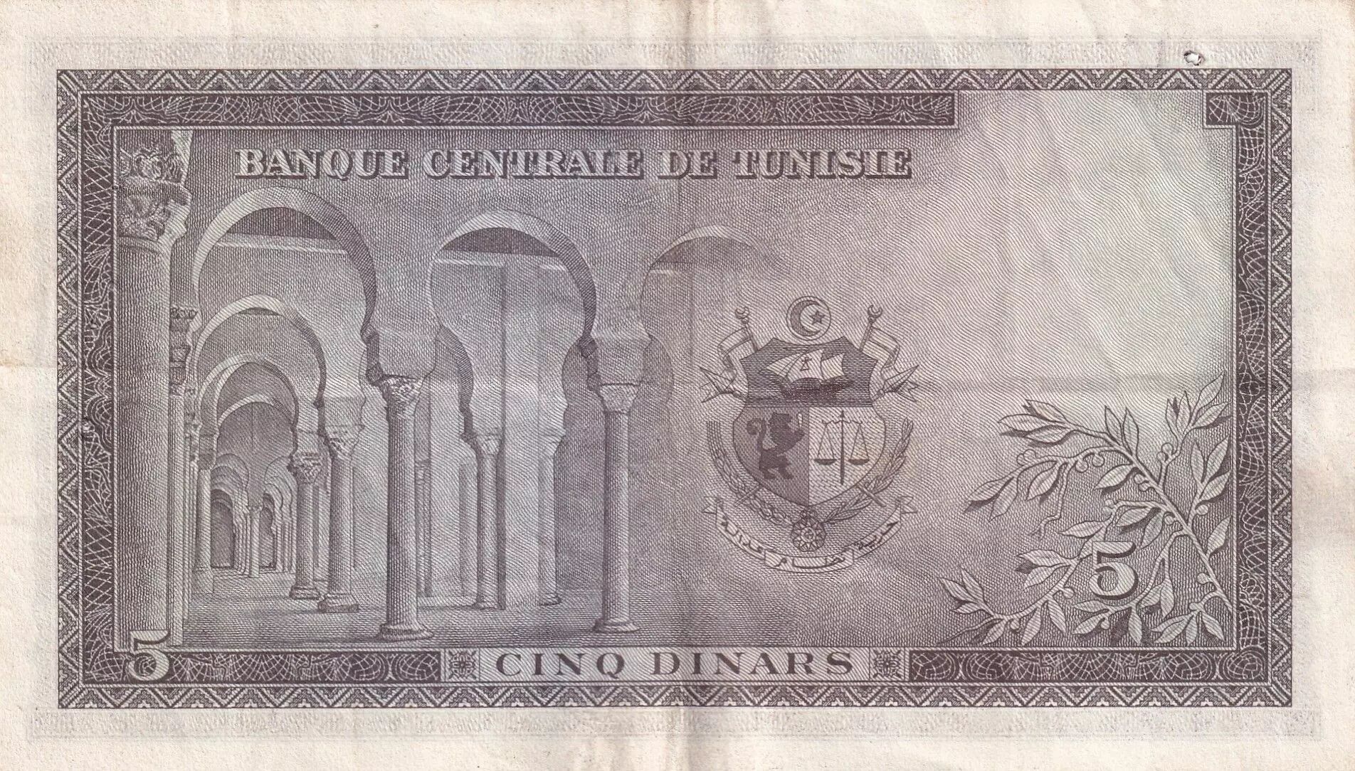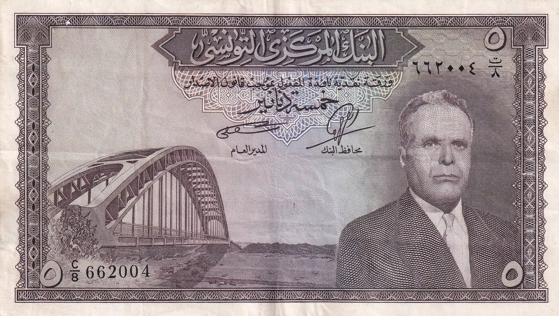 Home > World Banknotes > African Banknotes > Tunisia > Tunisia 5 Dinars - H. Bourguiba - Pont - Arches - 1958 - Sérial C.7. 662 004