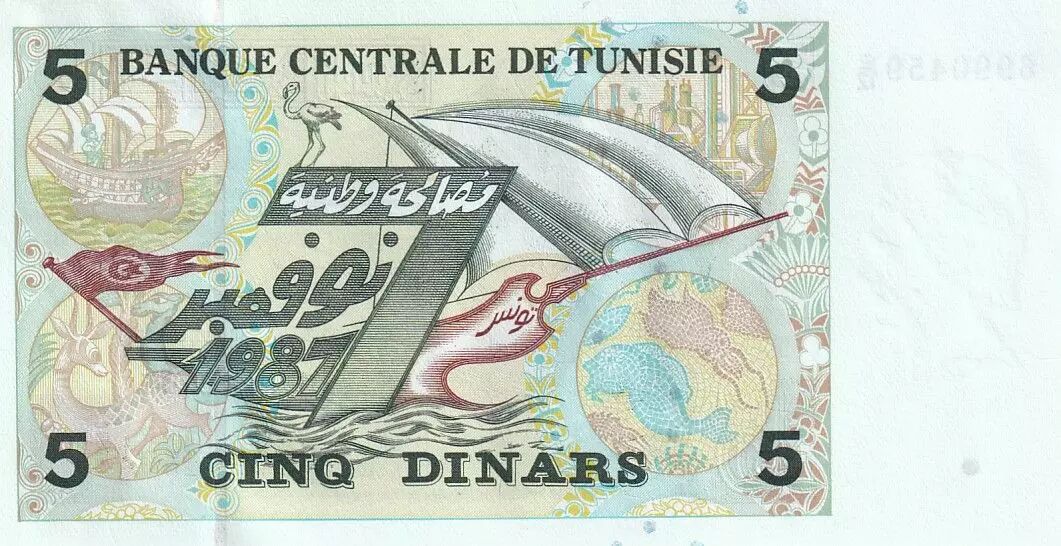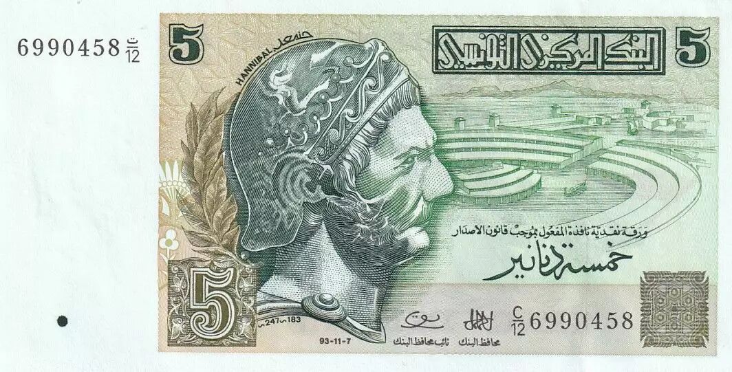 Home > World Banknotes > African Banknotes > Tunisia > Tunisia 5 Dinars - Hannibal - Carthaginians ships - Serial C.12 - 1993 - P.86