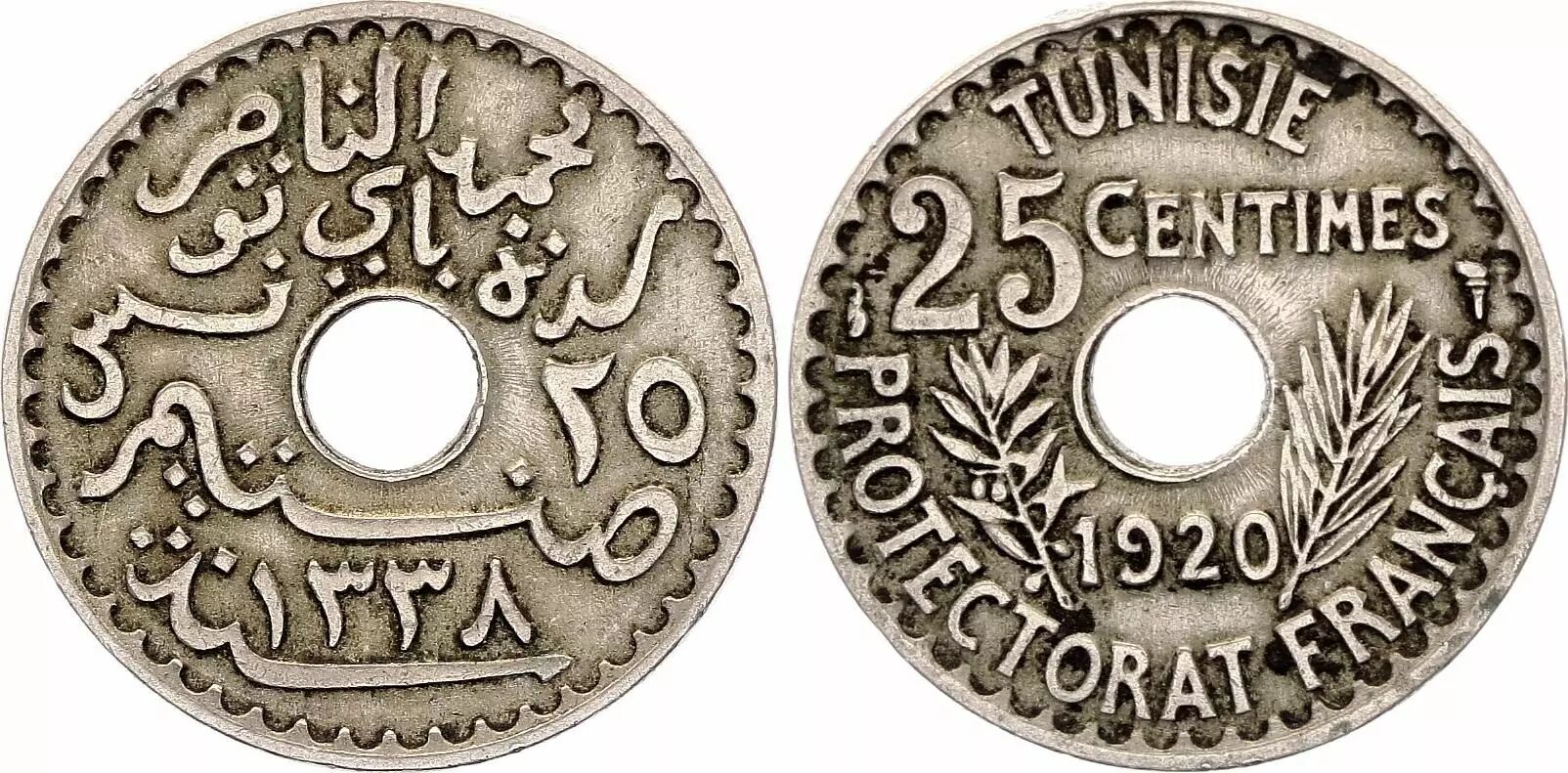 Accueil > Archivage > archivage-Monnaies du monde > Tunisie 25 Centimes Protectorat Français - 1338 (1920)