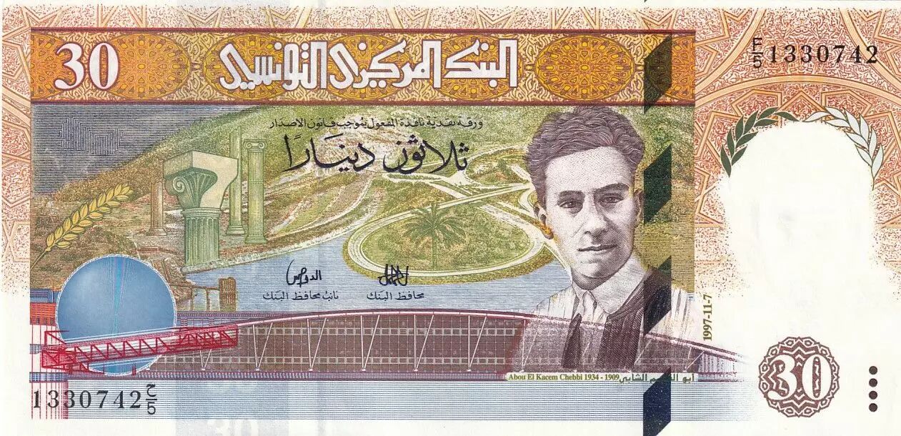 Billet Tunisie 30 Dinars - Abou El Kacem Chebbi - Série F.5 - 1997