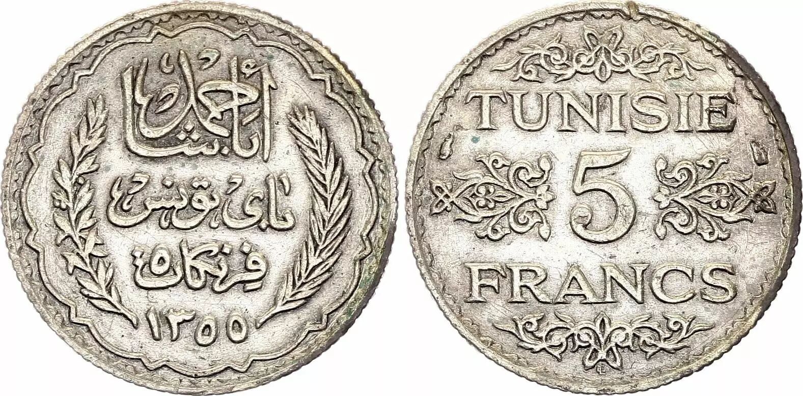 Accueil > Archivage > archivage-Monnaies du monde > Tunisie 5 Francs Protectorat Français - 1353 (1934)