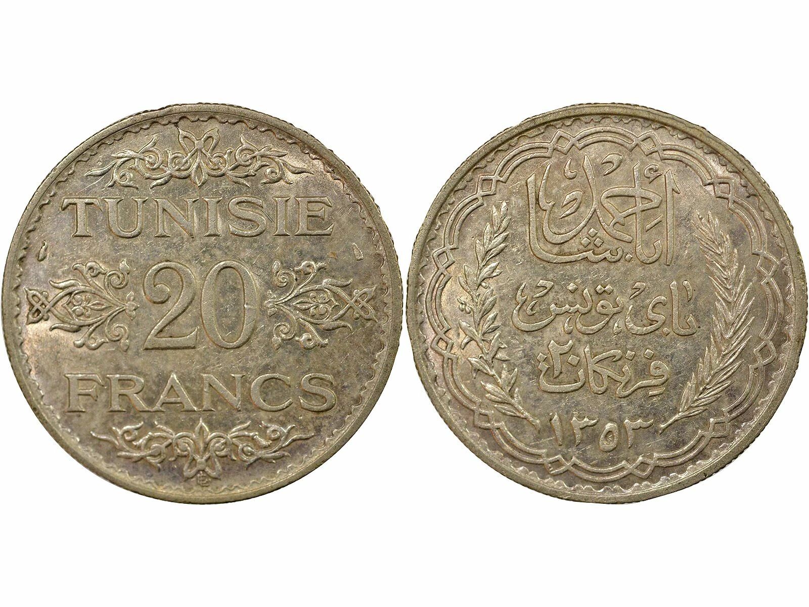 Pièce Tunisie Ahmad II - 20 Francs Argent - 1353 AH Paris