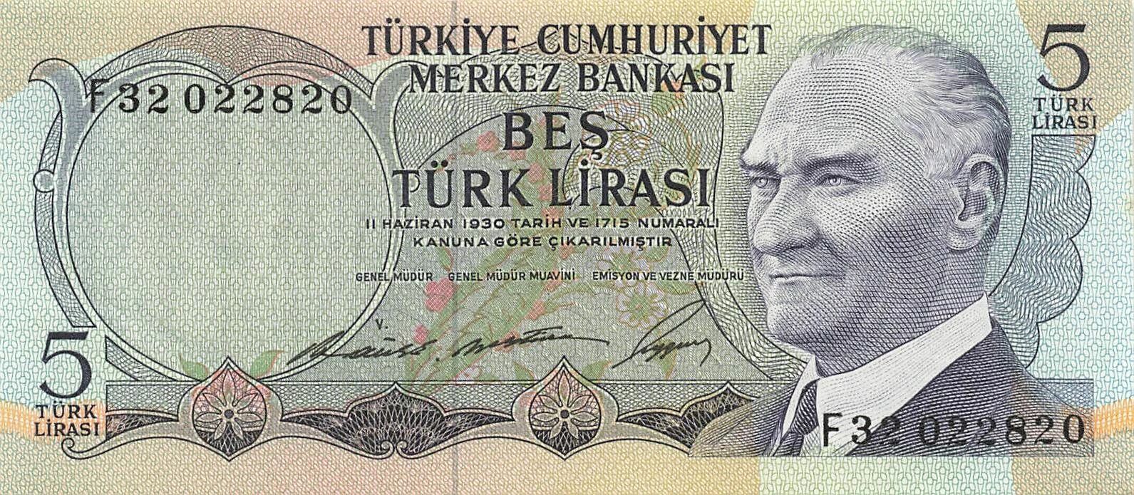 Home > World Banknotes > European Banknotes > Turkey > Turkey 5 Lira - Atatürk - ND (1968) - P.179