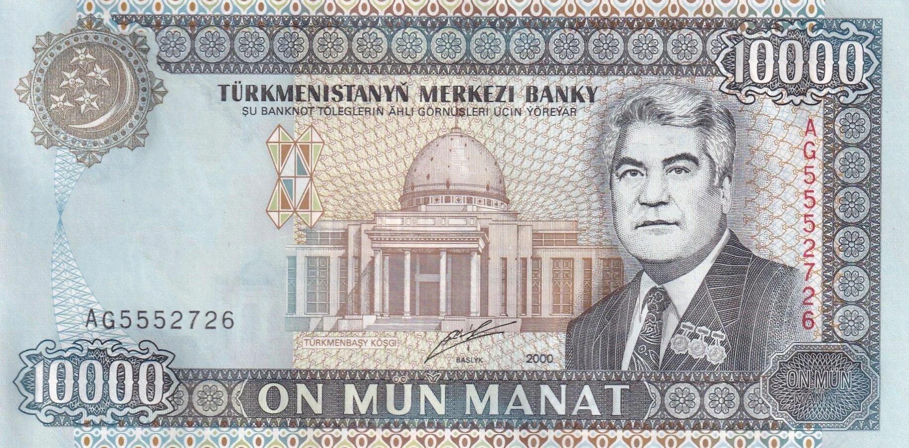 Le billet de banque de 10000 manat, émis par l'État du Turkménistan en 2000, est un spécimen de la série AG. Ses dimensions sont de 156 millimètres de longueur sur 78 millimètres de largeur.