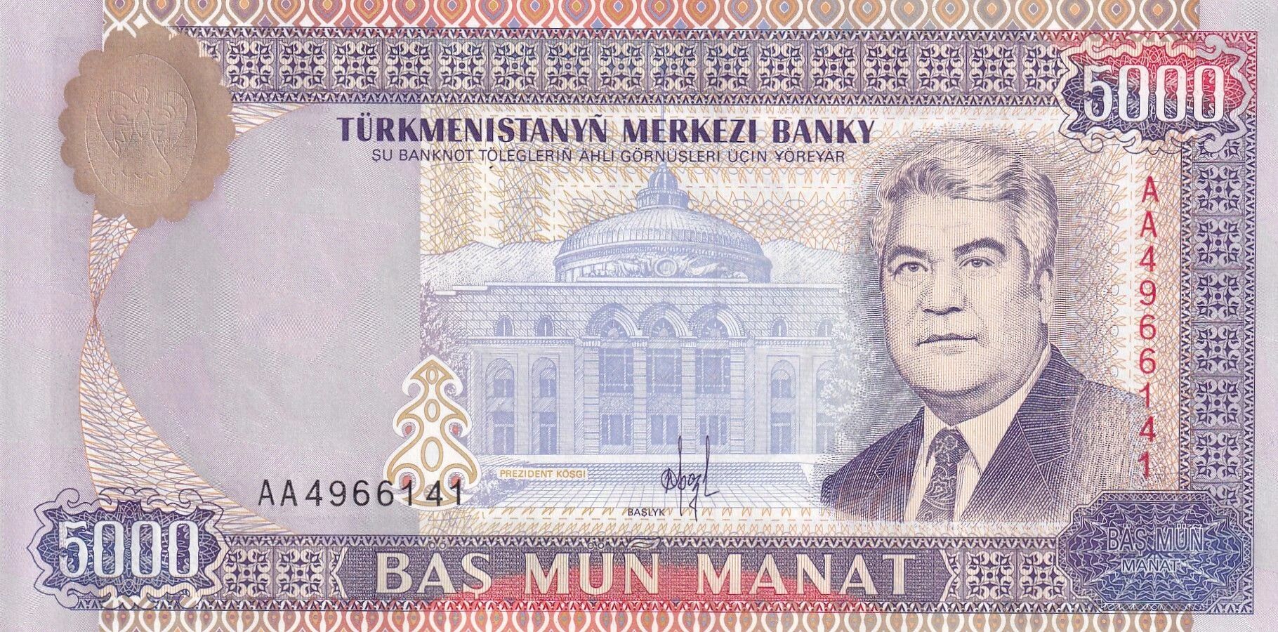 The 5000 manat banknote, issued by the State of Turkmenistan in 1996, is an example of the AA series. This banknote has a nominal value of 5000 manats.