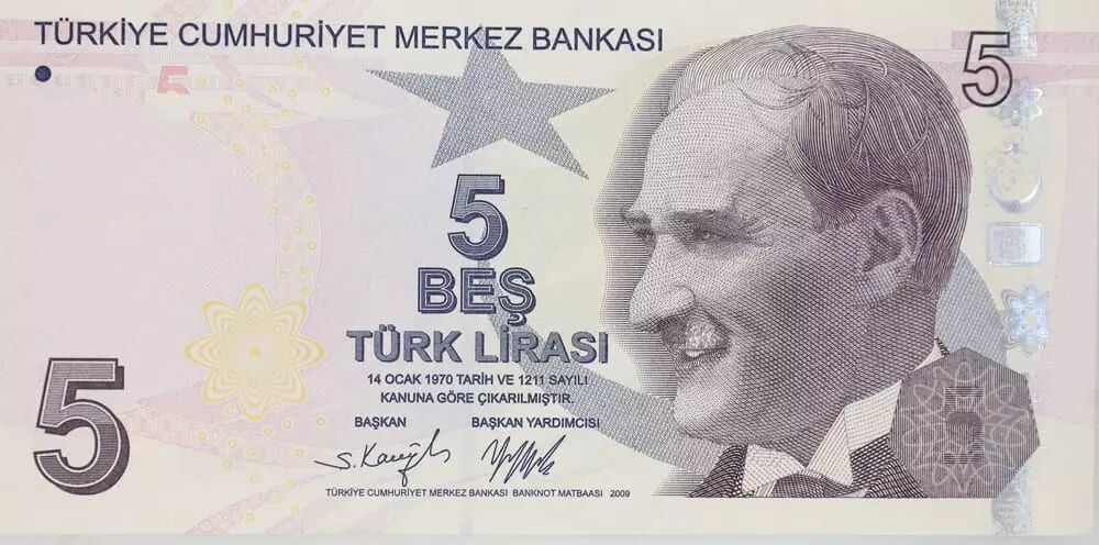 Sur le recto du billet, on retrouve un portrait du Président Mustafa Kemal Atatürk. On peut également lire les inscriptions suivantes : « TÜRK?YE CUMHUR?YET MERKEZ BANKASI » (Banque Centrale de la République de Turquie), la valeur nominale « 5 BE? TÜRK L?RASI » (5 Lires Turques), et la mention de l'imprimerie « TÜRK?YE CUMHUR?YET. MERKEZ BANKASI BANKNOT MATBAASI 2009 » (Imprimerie des billets de la Banque Centrale de la République de Turquie 2009).