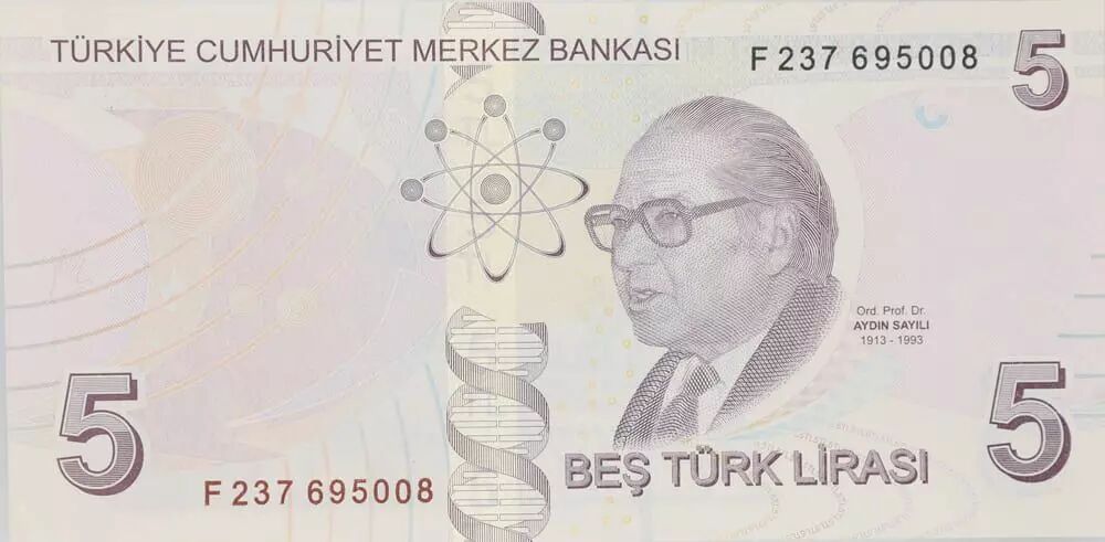 Le verso du billet présente un portrait de l'Ord. Ayd?n Say?l? (1913-1993), ainsi que des diagrammes illustrant le système solaire, l'atome, une grotte ancienne et une hélice d'ADN-Z gauchère.