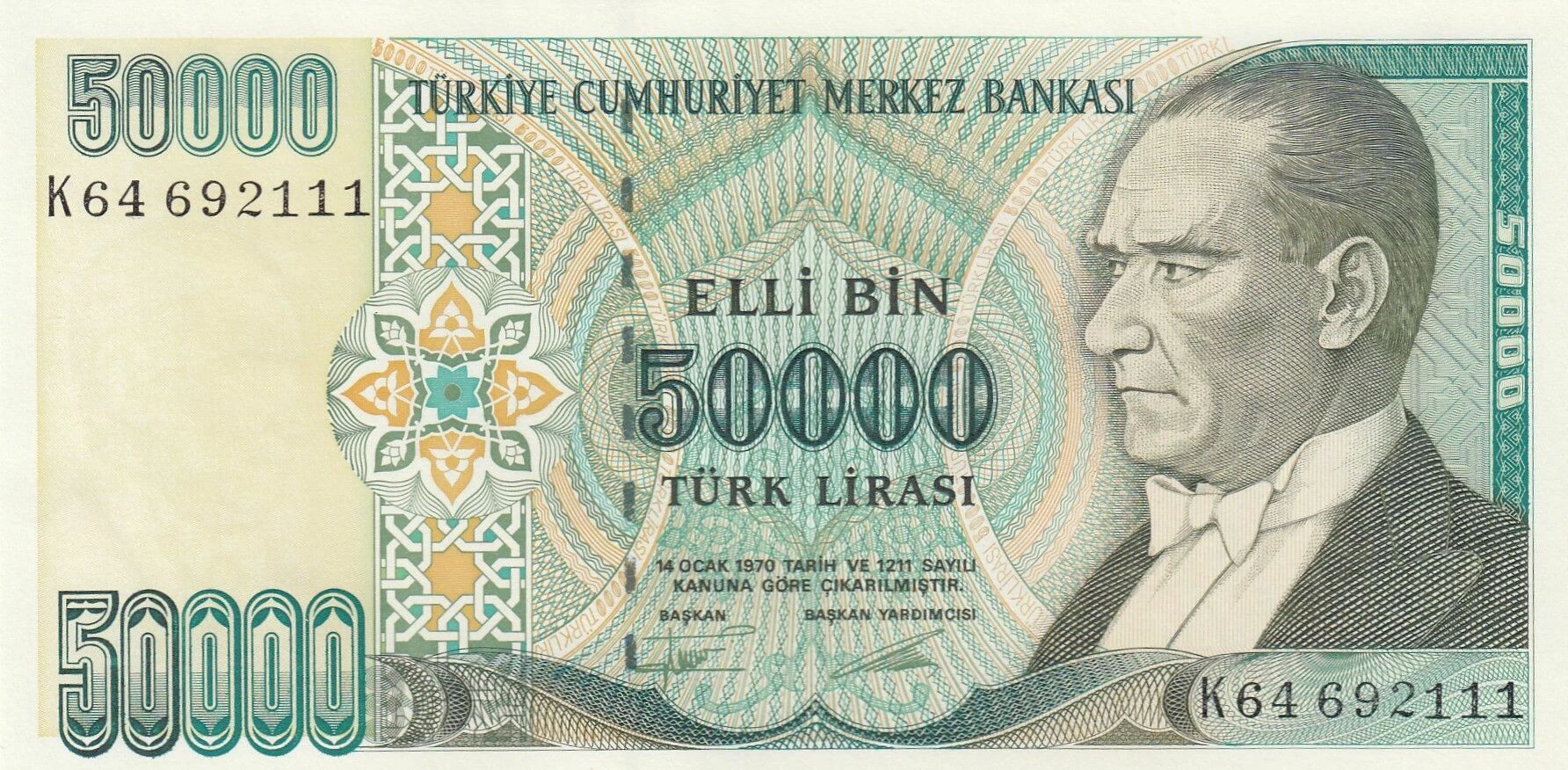 Le recto du billet présente un portrait de Mustafa Kemal Atatürk, fondateur de la République de Turquie. Les inscriptions en alphabet latin incluent "TÜRK?YE CÜMHUR?YET MERKEZ BANKASI" (Banque Centrale de la République de Turquie), la valeur faciale "ELL? B?N" (Cinquante Mille) et "50000 TÜRK L?RASI" (50000 Livre Turque). Une mention légale indique "14 OCAK 1970 TAR?H VE 1211 SAYILI KANUNA GÖRE ÇIKARILMI?TIR", précisant que le billet a été émis conformément à la loi n° 1211 du 14 janvier 1970.