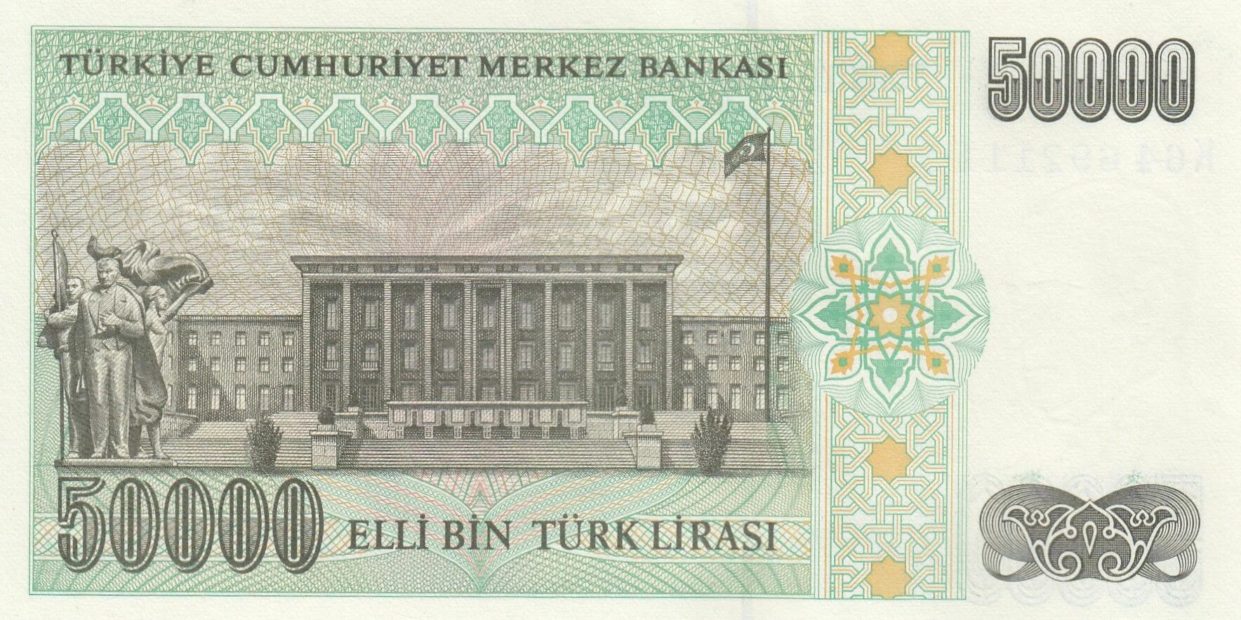 Le verso du billet représente la Maison du Parlement à Ankara, qui est aujourd'hui le Musée de la guerre d'indépendance et le Musée de la République. Les inscriptions en alphabet latin comprennent à nouveau "TÜRK?YE CÜMHUR?YET MERKEZ BANKASI" (Banque Centrale de la République de Turquie), ainsi que la valeur faciale répétée sous la forme "50000 ELL? B?N TÜRK L?RASI" (50000 Cinquante Mille Livre Turque). Le billet pèse 1 gramme.