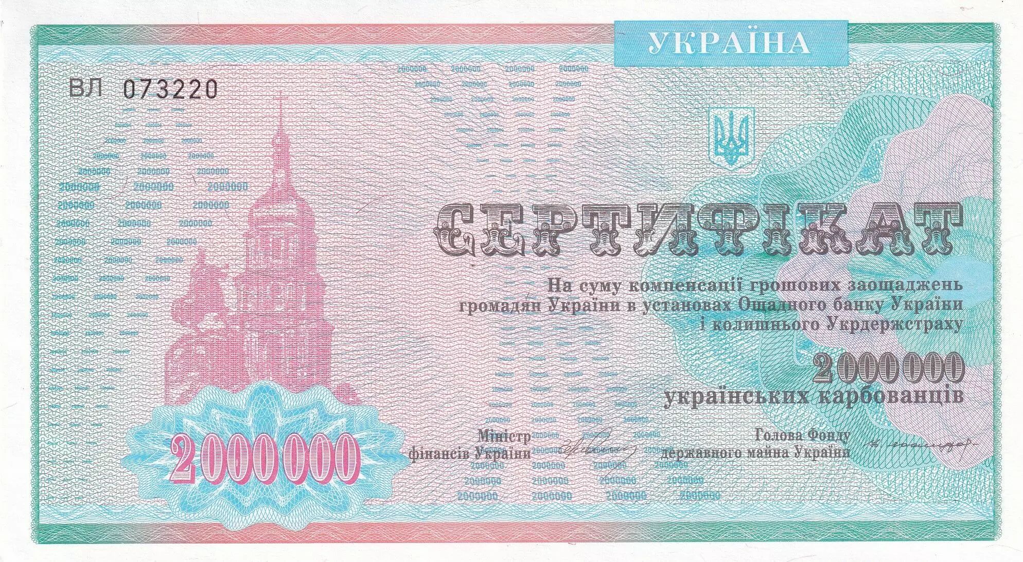 Accueil > Billets du Monde > Billets d'Europe > Ukraine > Ukraine 2000000 Karbovantsiv - Eglise - 1992 - P.91B