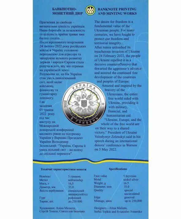 Coin Ukraine 5 Hryven - La force de l'unité - Blister - 2022