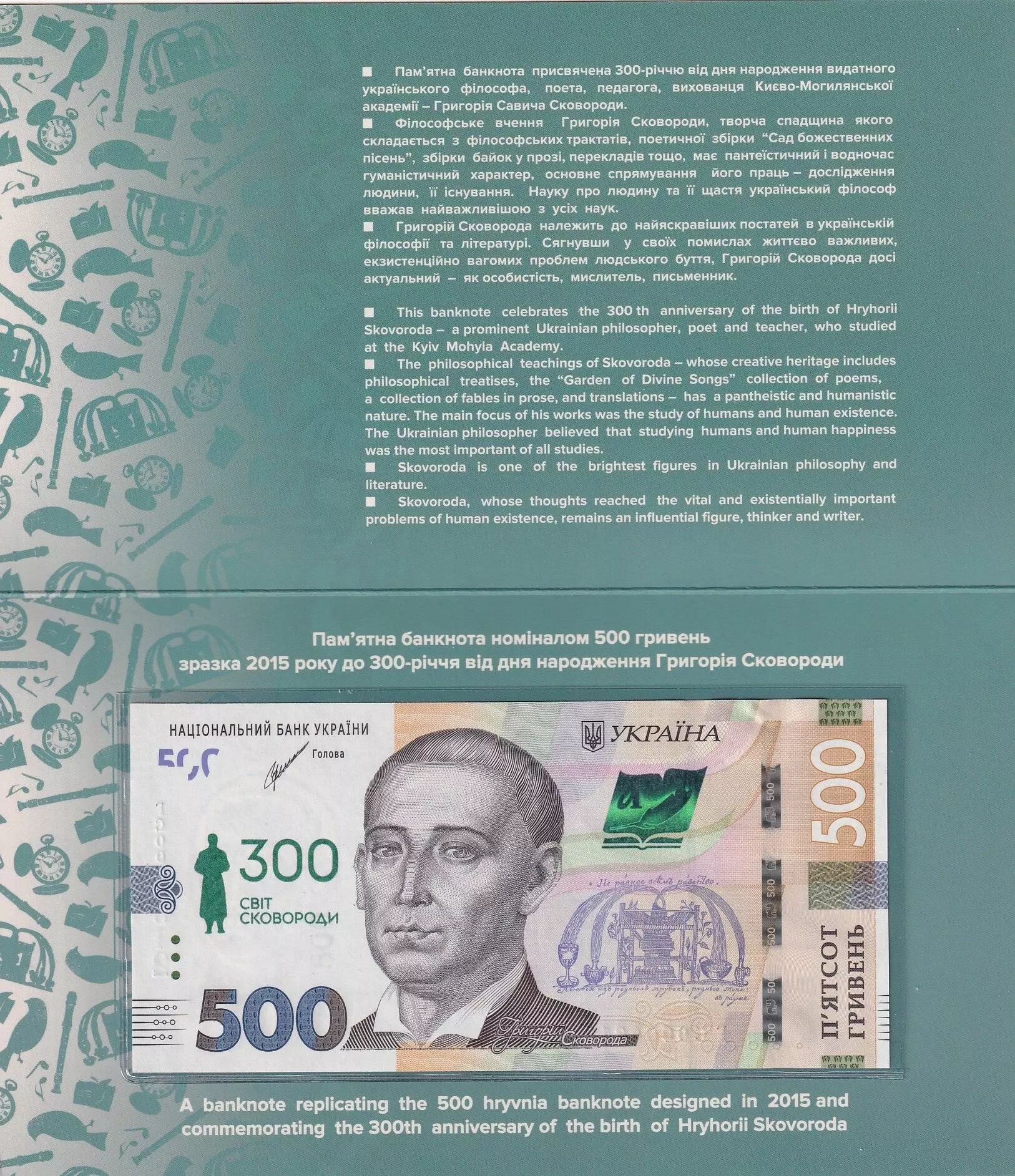 Home > World Banknotes > European Banknotes > Ukraine > Ukraine 500 Hryven - 300th Anniversary of Hryhorii Skovoroda - 2021 (2022)