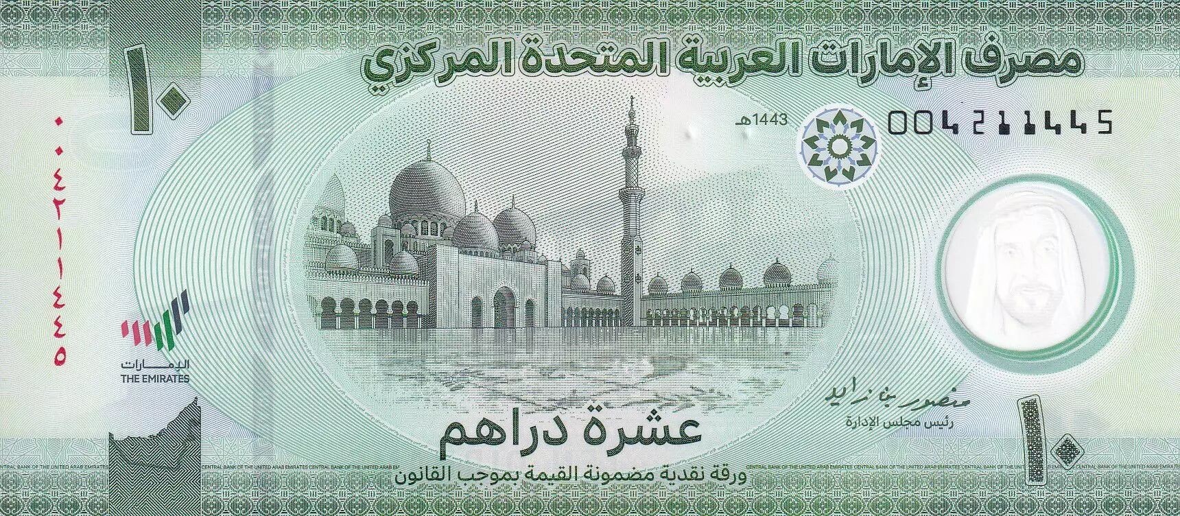 Home > World Banknotes > Asian Banknotes > United Arab Emirates > United Arab Emirates 10 Dirhams - Mosque - Polymer - 2022 - P.NEW