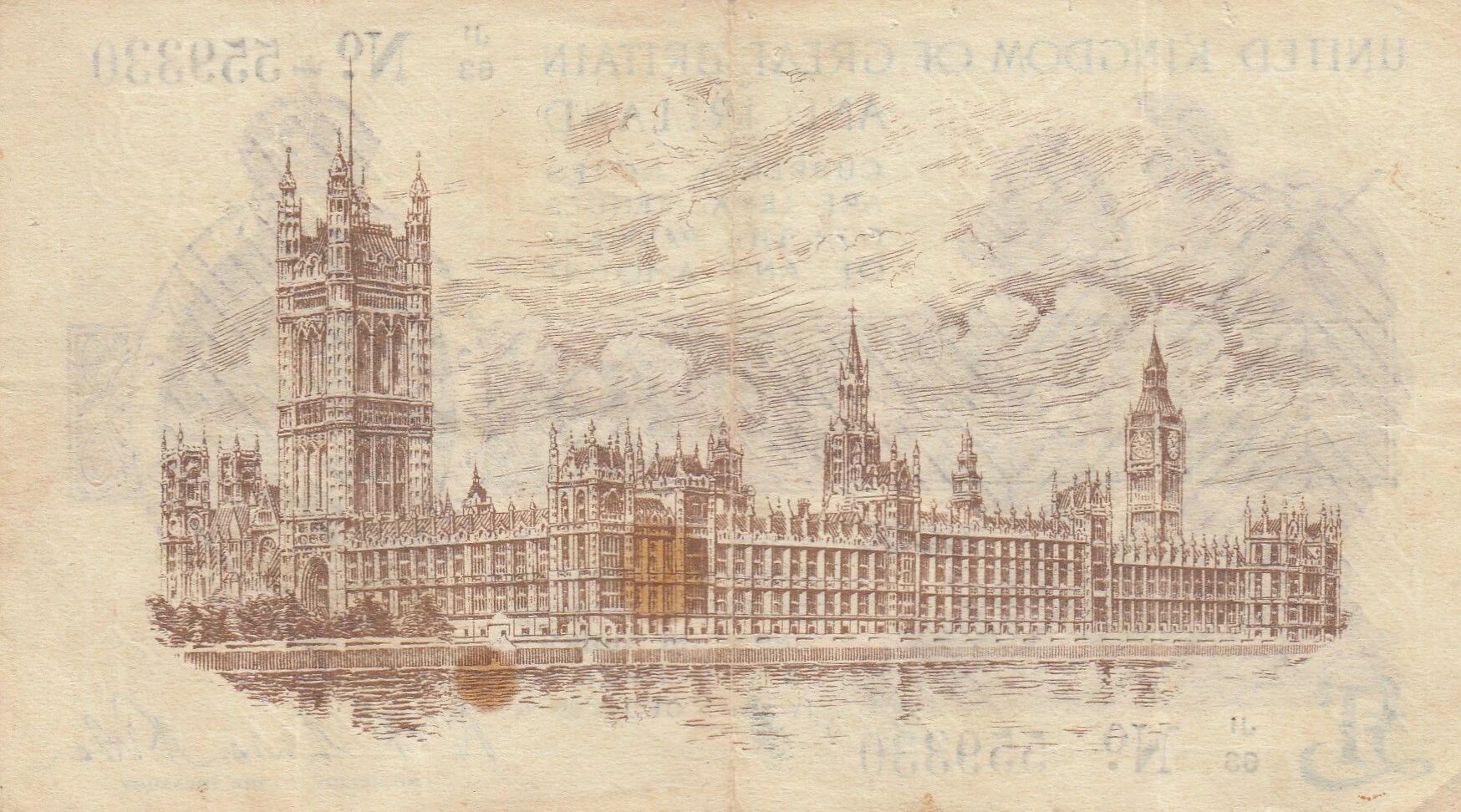 The reverse of the banknote depicts the Palace of Westminster. This building houses the House of Commons and the House of Lords of the British government. The engraver of this banknote is Edgar Bertram MacKennal.