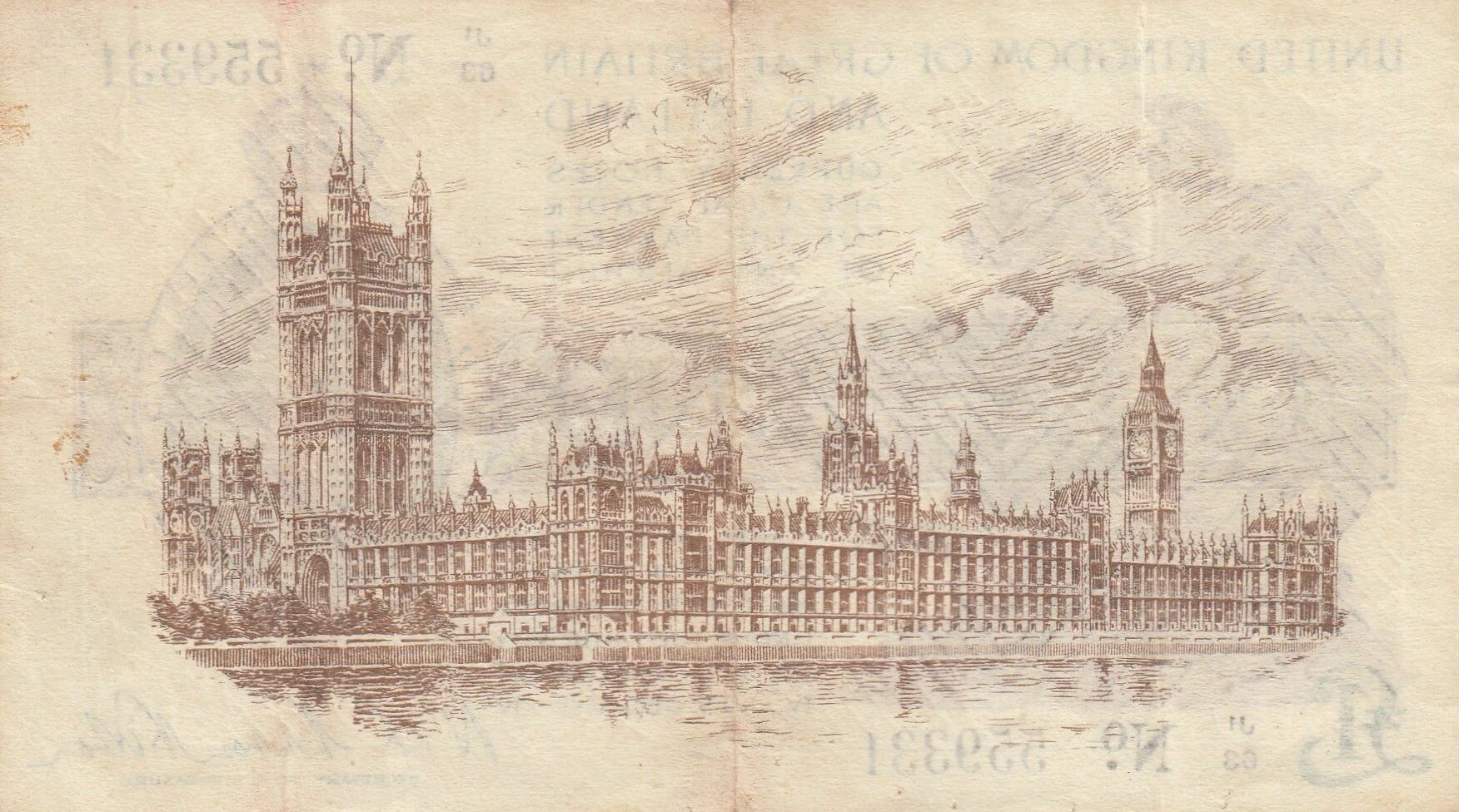 The reverse of the note depicts the Palace of Westminster, which houses the House of Commons and the House of Lords of the British government.