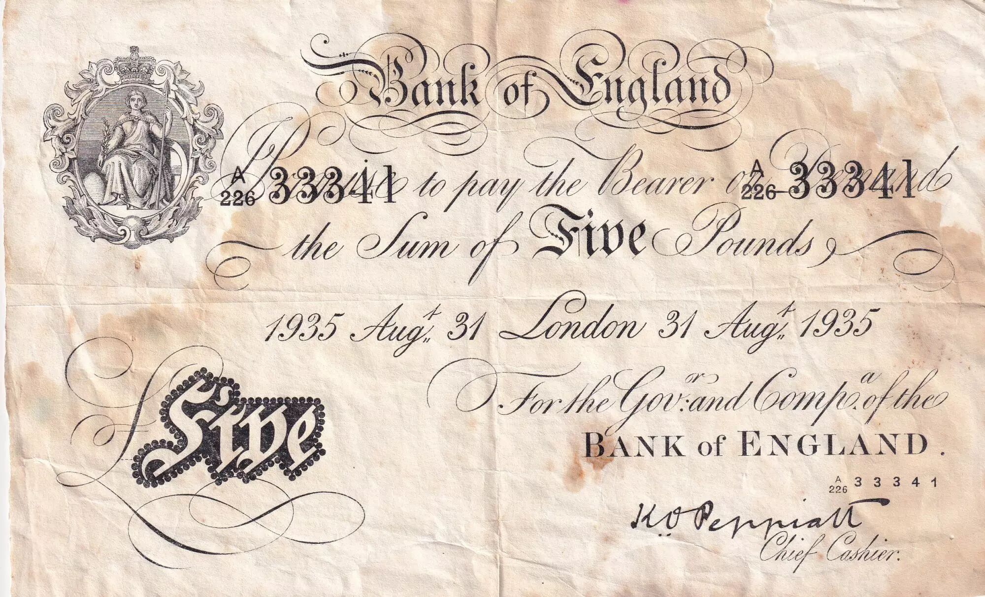 Banknote United Kingdom 5 Pounds - 31/08/1935 - Operation Bernhard - Serial A 226 - F - P.335