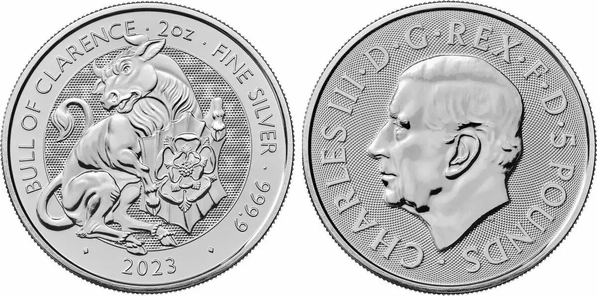 The reverse of the coin features a bull holding a shield adorned with a double Tudor rose. The legend "BULL OF CLARENCE·2 OZ· FINE SILVER·999.9" is inscribed at the top, while the date "2023" appears at the bottom. The initials "DL" of the designer David Lawrence are also present. The coin is made of fine silver with a fineness of 999.9.