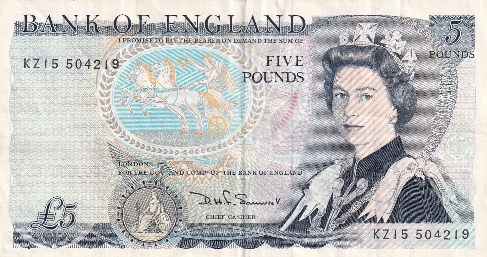 This banknote originates from the United Kingdom and has a face value of five pounds sterling.