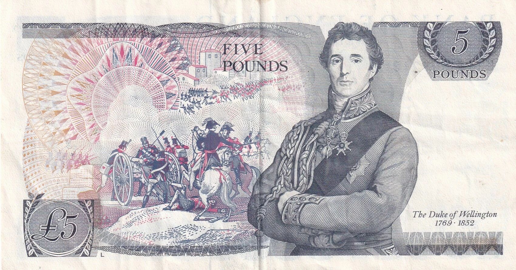 On the reverse, the note features Arthur Wellesley, Duke of Wellington, located in the center right. A battle scene in Spain is depicted in the center left. The dimensions of the note are 145 mm in length and 77 mm in width.