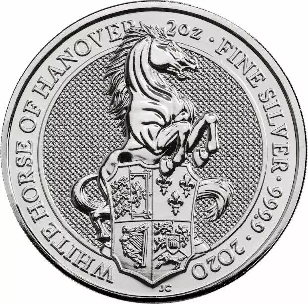 The reverse of the coin depicts the White Horse of Hanover supporting a shield. A Latin legend surrounds the motif, stating "WHITE HORSE OF HANOVER 2oz · FINE SILVER · 999.9 · 2020". The signature "JC" of Jody Clark is also present on this face.