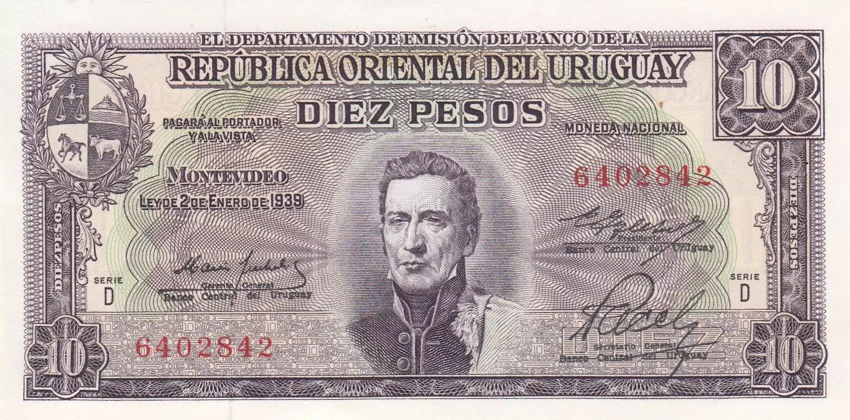 Le billet de 10 pesos uruguayens, daté du 2 janvier 1939, appartient à la série D. Il s'agit d'un billet de banque émis par l'institut d'émission de l'Uruguay, dont la valeur nominale est de 10 pesos.