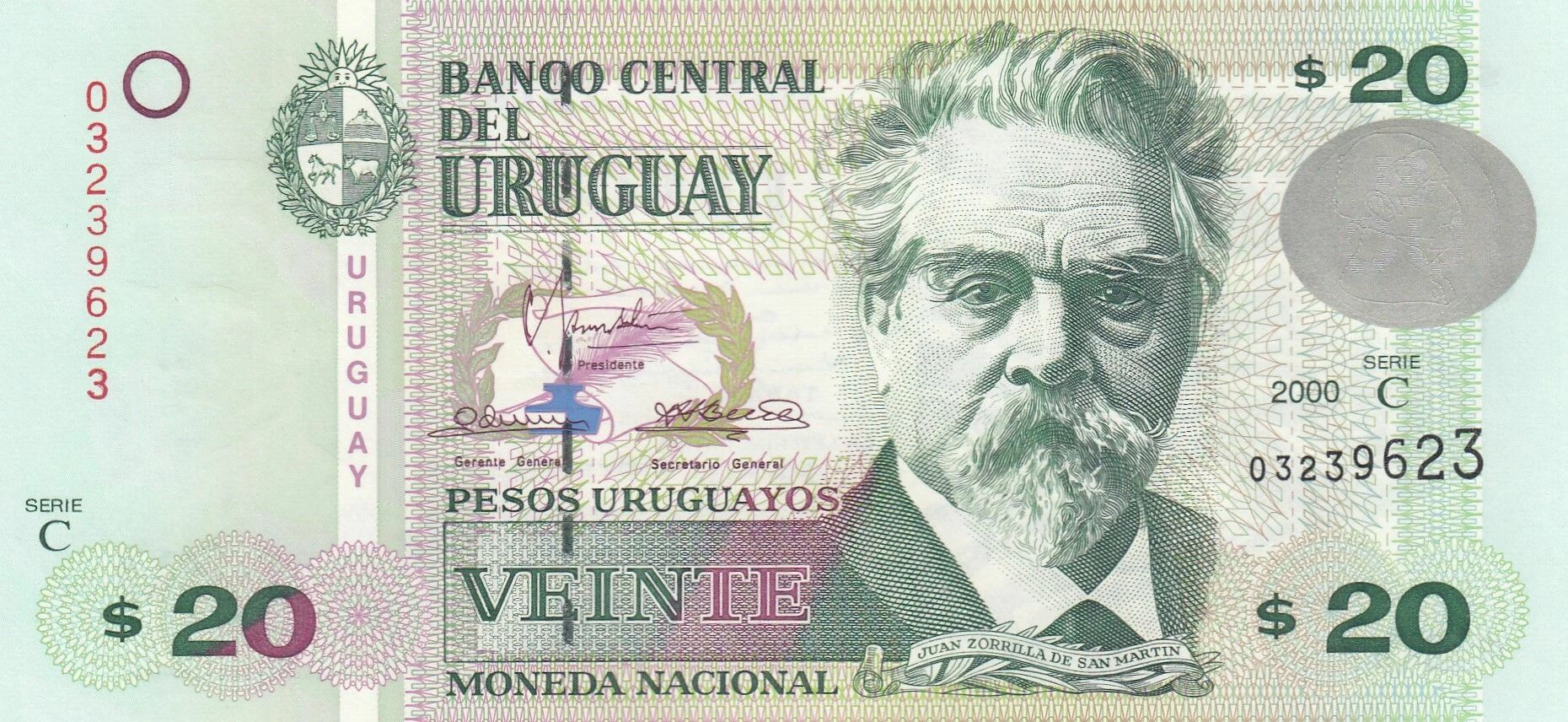 This banknote is issued by Uruguay and has a nominal value of 20 Uruguayan pesos. It dates from the year 2000 and belongs to Series C.