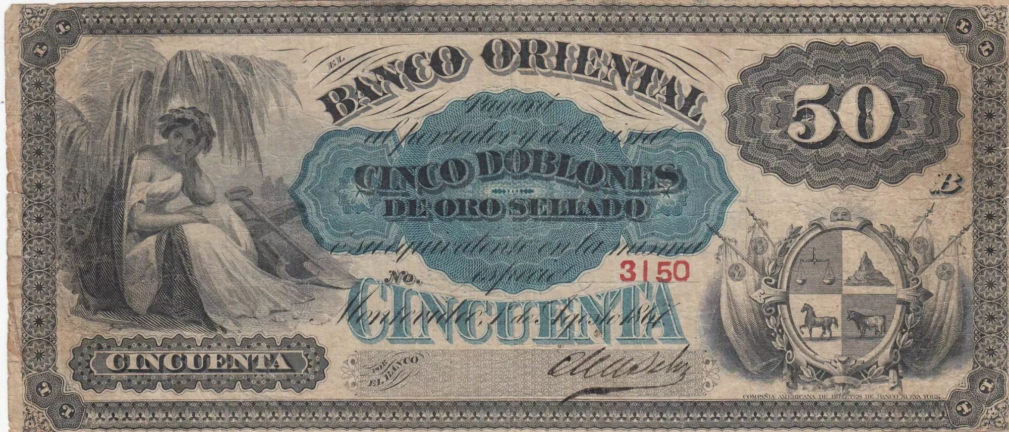 Billet Uruguay 50 Doblones Banco Oriental - 1867-1869