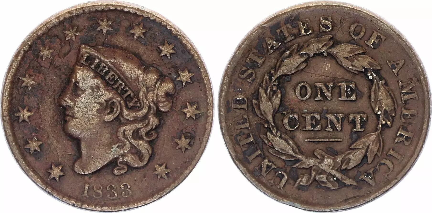 Cette pièce est un cent américain, frappée en 1833. Sa valeur nominale est d'un cent, représentant la plus petite unité monétaire de la devise américaine. Le matériau utilisé pour sa frappe est le cuivre, conférant à la pièce sa couleur et ses propriétés physiques distinctives. Son poids est de 10.79 grammes.