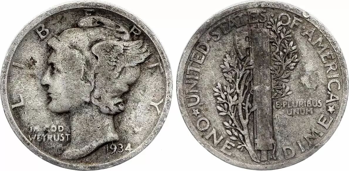 Coin USA 1 Dime Mercury - 1934 - Silver