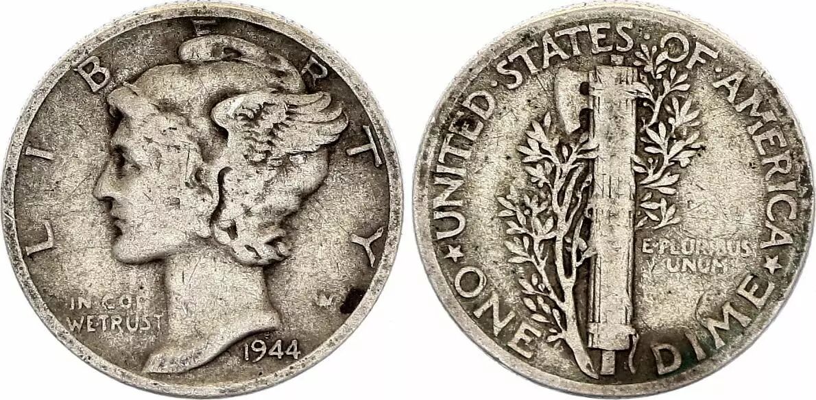 Coin USA 1 Dime Mercury - 1944 - Silver