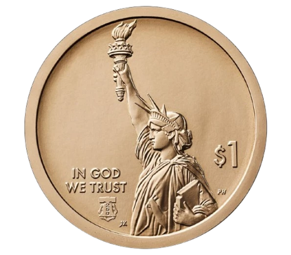 Le bord de la pièce est lettré. L'avers de la pièce représente la Statue de la Liberté de profil. Le dessin inclut également une marque privée représentant un engrenage stylisé, symbolisant l'industrie et l'innovation. En 2026, cette marque privée comprend une cloche de la liberté avec l'inscription "250", commémorant le demi-cinquantenaire de la fondation des États-Unis. Le revers de la pièce met en scène le Dr. Norman Borlaug tenant une gerbe de blé et des tiges de blé, soulignant ainsi son rôle de pionnier dans le développement de cultures résistantes, essentielles pour nourrir une population mondiale croissante.