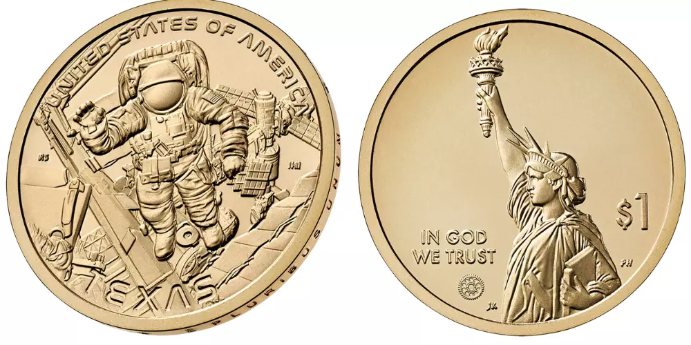 The reverse of the coin depicts an American astronaut performing a spacewalk outside the International Space Station. The inscriptions "UNITED STATES OF AMERICA" and "TEXAS" are also present, as well as the initials "RS" of the engraver Ronald D. Sanders.